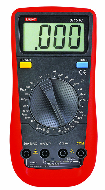 UT151C сандық мультиметрі тұрақты және айнымалы кернеуді, тұрақты және айнымалы токты, кедергіні, сыйымдылықты, температураны, диодты сынауды, тізбекті теруді (дыбыстық сигналмен) өлшеуге арналған. Диапазонды қолмен таңдау.