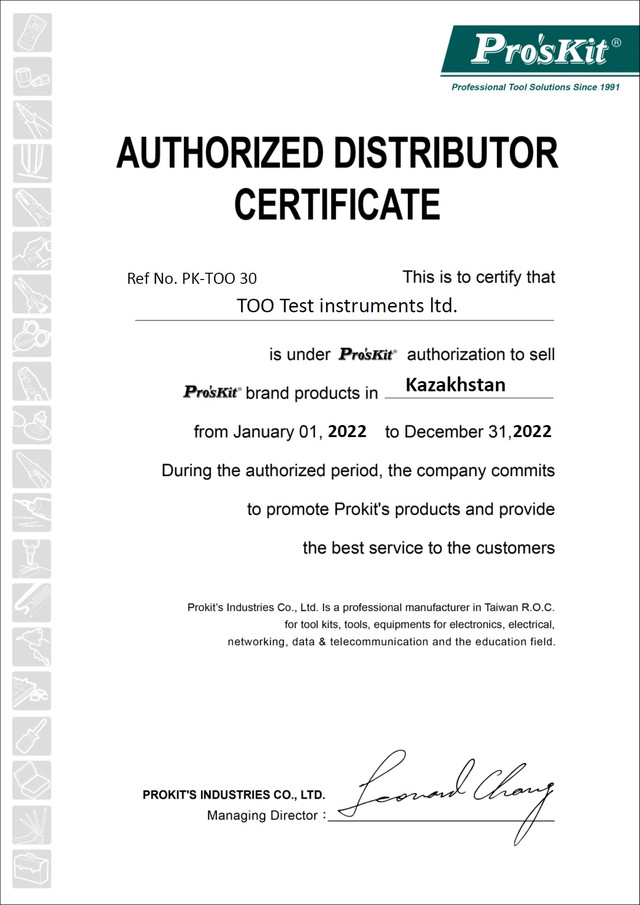 ТОО Test instruments является официальным дистрибьютором компании Pro`skit и поставляет оригинальную продукцию напрямую от производителя.