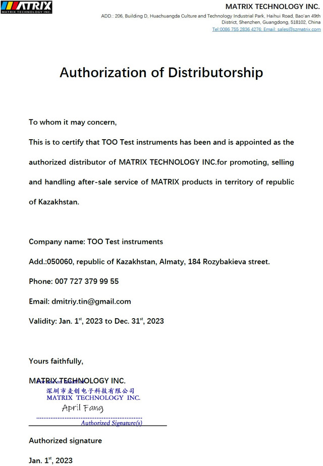 ТОО Test instruments является официальным дистрибьютором компании MATRIX и поставляет оригинальную продукцию напрямую от производителя.
