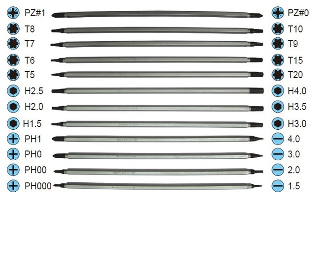 Набор Pro'sKit SD-9824 состоит из отвертки с прецизионными двусторонними битами разных типов (12 бит, 24 размера).