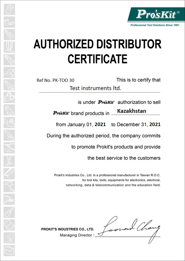 ТОО Test instruments является официальным дистрибьютором компании Pro`skit и поставляет оригинальную продукцию напрямую от производителя.