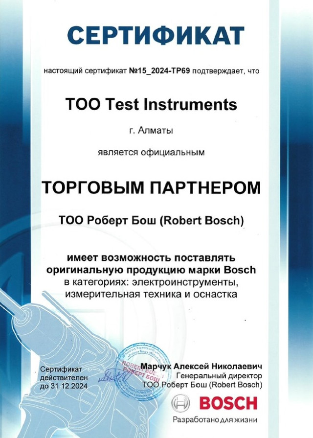 ТОО Test instruments является официальным торговым партнером компании ТОО Роберт БОШ и поставляет оригинальную продукцию напрямую от производителя.