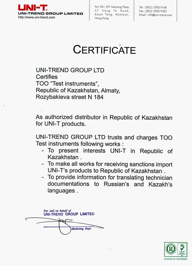 ТОО Test instruments является официальным дистрибьютором компании UNI-TREND GROUP LIMITED и поставляет оригинальную продукцию напрямую от производителя.